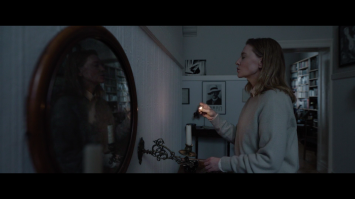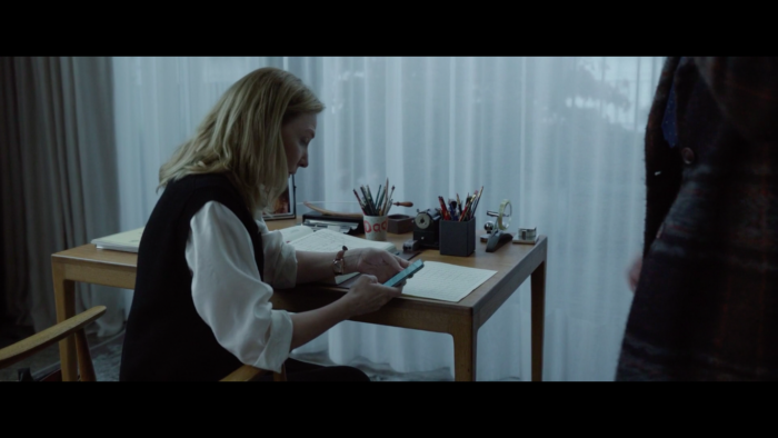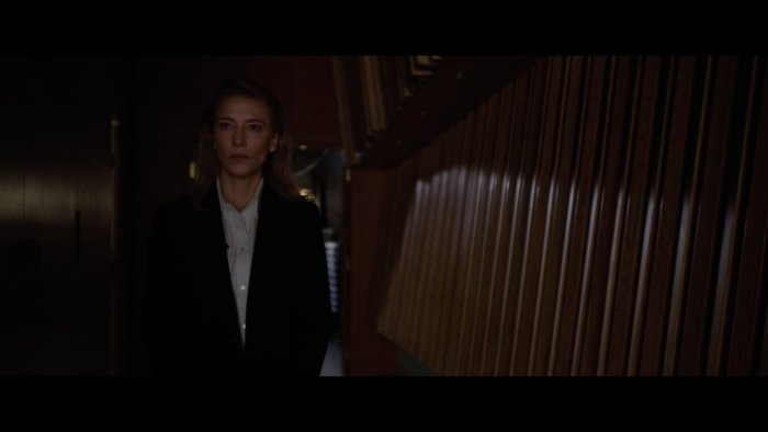Pretending to find a “loose pill” in a drawer, Tár gives Sharon her medication and puts on a song to lower her heart rate. Over the instrumental music, Tár sings, “I’m feelin’ a feelin’ for something there ain’t too much of.” Again, the “feelin’” of this marriage is lacking, and as Tár goes through the motions of spousal care and affection, the content of the song she sings underlines its absence.