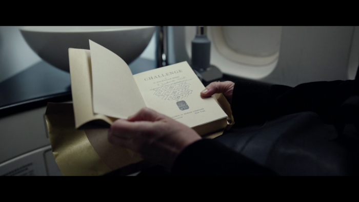 Before writing “AT RISK,” we find Tár in the bathroom, unwrapping a gift from Krista, Vita Sackville-West’s novel, The Challenge (Sackville-West was an early 20th-century modernist, lesbian writer who famously had an affair with Virginia Woolf). This novel revolves around two women who, as they vacation together one summer, decide to spend their lives together. Ultimately, though, they return to their respective homes and husbands. Pausing this scene as Tár turns to the book’s title page, you’ll find it decorated with a design widely used by the Shipibo-Conibo. Later in the film, when Francesca tearfully informs Tár of Krista’s suicide, we discover that Tár, Krista, and Francesca spent a summer together on the Ucayali River (in the Peruvian region of the Shipibo-Conibo).3Significantly, Francesca, who usually wears her hair in neat updos, wears her hair down in the same style and cut as Krista in this scene. In this way, a chain of palindromes and textual allusions presents the mysterious love triangle between these women.