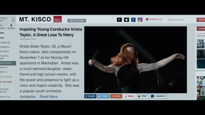 While we never see Krista’s face, we become familiar with her shoulder-length copper hair as her specter sporadically flashes on the screen. Furthermore, Tár repeatedly fails to erase Krista’s phantasmic trace from her life. Early in the film, she notably and weakly attempts to clear her inbox of any correspondence with or about Krista (she also takes her assistant’s, Francesca’s, laptop to do the same). Of course, Tár spotlights her guilt by confirming her abusiveness through several emails she writes. These emails discourage various orchestras from sponsoring Krista as an Accordion scholar (Tár’s organization that mentors female conductors and pairs them with esteemed orchestras).