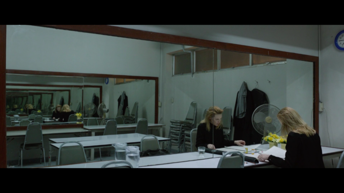 Chiasmus is also visually codified in the many mirrors and reflections we see in the film. At the film’s end, Tár peruses her scorebook in a vacant dressing room in the Philippines (where she is exiled after her dismissal from the Berlin Philharmonic) before her final conducting performance in the film. She sits facing a mirror that creates an infinity effect, and after receiving her stage call, she walks through a hallway marked by similar, repeating door frames. She stands backstage breathing nervously, just as she did at the film’s beginning, before appearing in front of the audience for her New Yorker talk.